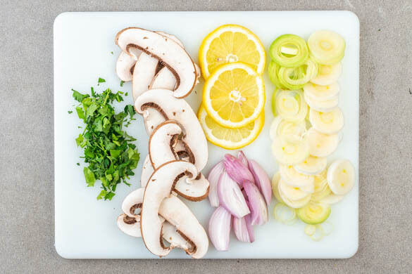 In einem großen Topf ausreichend gesalzenes Wasser für die Pasta zum Kochen bringen. Die Schalotten schälen und längs in ca. 1cm breite Spalten schneiden. Den Lauch in dünne Ringe schneiden. Die Pilze in dünne Scheiben schneiden. Die Zitrone in dünne Scheiben schneiden. Die Petersilie samt Stängeln grob hacken.