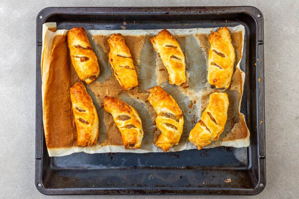 Die Sausage Rolls so auf den Backblechen platzieren, dass die Nahtstelle zur Seite zeigt, auf der Oberseite zweimal diagonal einschneiden. Das aufbewahrte Ei mit 2EL Wasser verrühren und die Sausage Rolls damit bestreichen, dann im Ofen 18–22Min. backen, bis der Teig goldbraun und die Füllung gar ist.