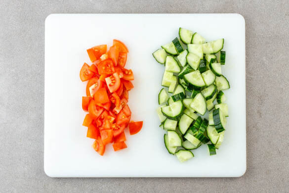 Die Gurke längs vierteln und in ca 0,5cm kleine Stücke schneiden. Die Tomaten grob würfeln.