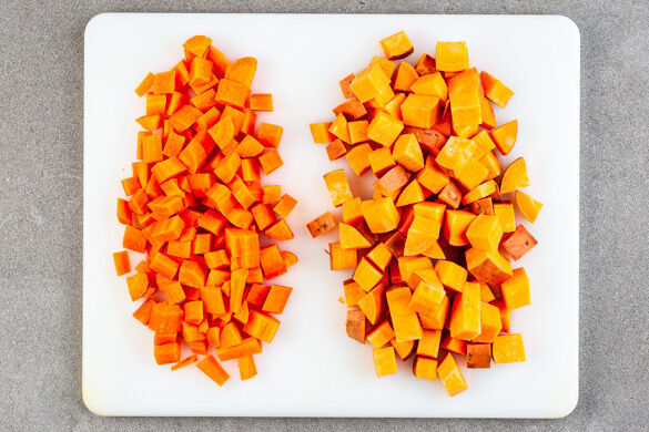 Den Backofen auf 240°C (220°C Umluft) vorheizen. Die Süßkartoffeln samt Schale in ca. 2cm große Würfel schneiden. Die Karotten ggf. schälen und ebenfalls in ca. 2cm große Würfel schneiden.