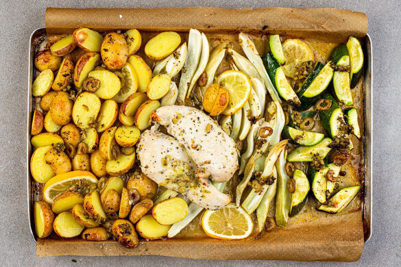 Es gibt viele gute Gründe dafür, unsere Bio-Hähnchenbrust zusammen mit dem Gemüse im Ofen zu backen: Die Röstaromen von Oregano, Knoblauch und Oliven verteilen sich so besonders gut auf das Fleisch und die Kartoffeln. Außerdem bleibt das Hähnchen durch die austretende Flüssigkeit von Fenchel und Zucchini besonders saftig. Und drittens? Gibt es heute keine Töpfe und Pfannen zu schrubben. Großartig!