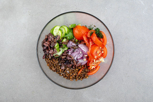 Die Oliven in Ringe schneiden. Die Linsen in ein Sieb abgießen und die ½ des Brühgewürzes unter die gegarten Linsen rühren. Dann mit den Zwiebelstreifen, dem restlichen Knoblauch, den Tomaten, den Gurken, dem restlichen Dill und den Oliven vermengen. Mit 1EL Olivenöl, 1EL Essig sowie je 1 Prise Salz und Pfeffer würzen.