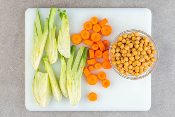 Den Backofen auf 240°C (220°C Umluft) vorheizen. Den Fenchel halbieren und in 1–2cm breite Spalten schneiden. Die Karotte ggf. schälen und in ca. 1cm breite Scheiben schneiden. Die Kichererbsen in einem Sieb mit kaltem Wasser abspülen, abtropfen lassen und mit etwas Küchenkrepp trocken tupfen.