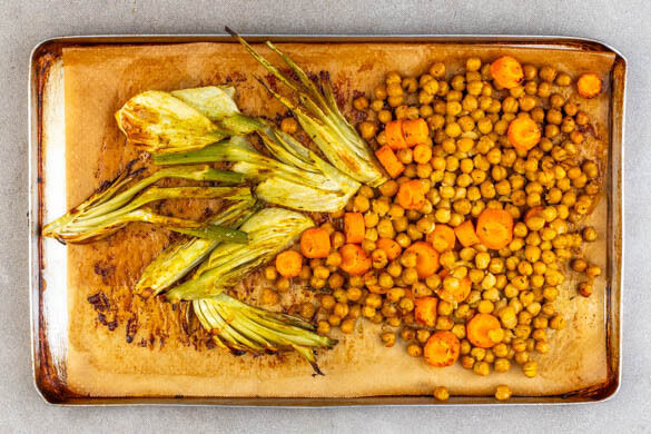 Die Kichererbsen, den Fenchel und die Karotten auf einem mit Backpapier ausgelegten Backblech mit 2EL Olivenöl, der Gewürzmischung und je 1 Prise Salz und Pfeffer vermengen. Gleichmäßig verteilen und 20–25Min. im Ofen rösten, bis das Gemüse goldbraun und gar ist.