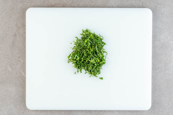 Den Koriander fein schneiden. Die Minzeblätter von den Stängeln zupfen und ebenfalls fein schneiden.