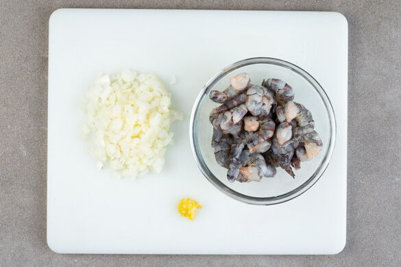 In einem großen Topf ausreichend gesalzenes Wasser für die Pasta zum Kochen bringen. Die Garnelen in einem Sieb mit kaltem Wasser abspülen, mit etwas Küchenkrepp trocken tupfen und mit 1TL Salz würzen. Die Zwiebeln schälen und fein würfeln. Den Knoblauch schälen und fein reiben.