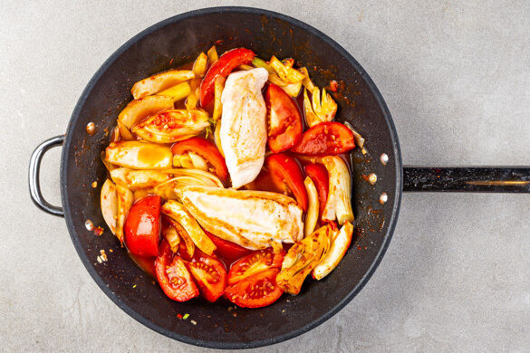 Heute können wir es kaum erwarten, in unsere Küchenschürze zu schlüpfen. Denn wir servieren saftig-zartes, in feinster Tomaten-Fenchel-Sauce gedämpftes Hähnchenfilet mit knusprigen Pankokrumen auf al dente gekochter Penne. Die zylinderartige Form der Pasta nimmt die aromatische, mit Fischsauce und Knoblauch gewürzte Sauce übrigens besonders gut auf. So wird jede Gabel zum vollen Genuss – Bonus!