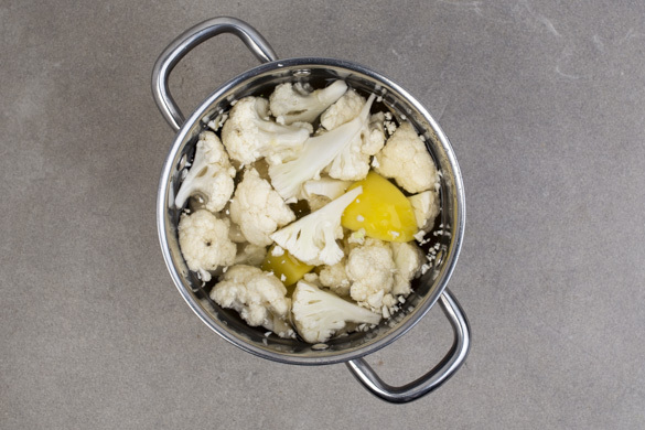 Die Kartoffeln in das kochende Wasser geben und in 15–20Min. gar kochen. Nach 10Min. der Kochzeit die Blumenkohlröschen zu den Kartoffeln geben und mitkochen, bis beide Gemüse gar sind. Mit einem Messbecher ca. 300ml Kochwasser abschöpfen, dann das Gemüse in ein Sieb abgießen.