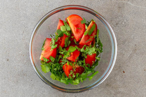2EL Olivenöl mit 2EL Einlegesud, der ½ der Gewürzmischung und je 1 kräftigen Prise Zucker, Salz und Pfeffer zu einem Dressing verrühren. Die Tomaten jeweils in 8 Spalten schneiden. Den Koriander samt Stängeln grob schneiden. Die Tomaten und die ½ des Korianders mit dem Dressing vermengen und beiseitestellen.