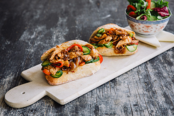 Suriname ist das kleinste unabhängige Land Südamerikas und gehörte bis 1975 zu den Niederlanden. Die typische Landesküche weist kreolische Einflüsse auf, ist aber auch von der indischen, indonesischen und chinesischen Küche geprägt. Eine aromatische Geschmackswelt, die du heute mit diesen leckeren Sandwiches kennenlernst, für die das zarte Hähnchen in einer typisch surinamischen, süßlich-scharfen Sauce gegart wird.