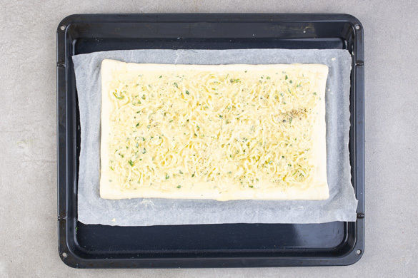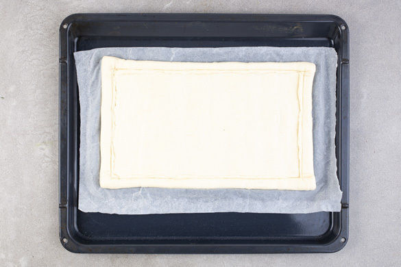 Den Teig mit dem Papier nach unten auf einem Backblech ausrollen und an den Seiten 1,5–2cm einrollen, sodass ein schöner Rand entsteht.