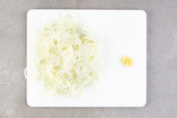 Den Backofen auf 200°C Umluft (220°C Ober-/Unterhitze) vorheizen. Die Zwiebeln schälen und in feine Ringe schneiden. Tipp: Am besten eignet sich dafür ein Gemüsehobel. Die Zwiebelringe in kaltes Wasser geben und die einzelnen Schichten voneinander trennen. Den Knoblauch schälen und fein würfeln oder reiben.