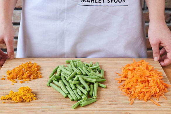 Die Karotten schälen und auf der groben Seite der Küchenreibe raspeln. Das holzige Ende der Bohnen entfernen und diese in 2cm lange Stifte schneiden. Die Schale von der Orange reiben und den Saft auspressen. Die Aprikosen möglichst fein würfeln.
