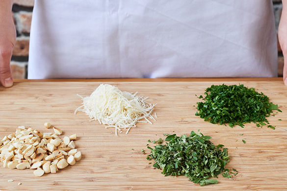 Eine große Pfanne mittelhoch erhitzen und die Mandeln darin ohne Öl goldbraun rösten, dann grob hacken. Den Parmesan fein reiben. Oregano von den Stielen zupfen. Die Petersilie mit den Stielen grob hacken. Etwas Petersilie zur Garnitur zur Seite legen.