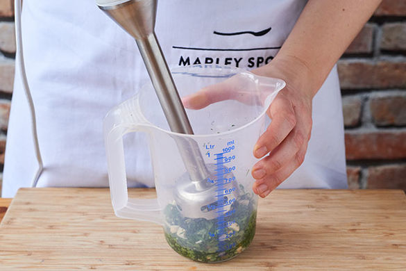 Die Petersilie, die Mandeln, den Oregano und den Parmesan mit 5EL Olivenöl zusammen zu einer feinen Paste pürieren. Eventuell 1-2EL Wasser hinzufügen, damit das Pesto cremig wird. Mit einer Prise Zucker, Salz und Pfeffer abschmecken.