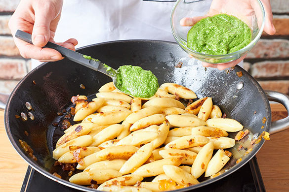 Hier ist wirklich was für jeden dabei: Knusprig gebratene Schupfnudeln schwenken wir in nussigem grünen Pesto. Dazu mischen wir einen knackigen Bohnensalat mit Karotten und Orangendressing.