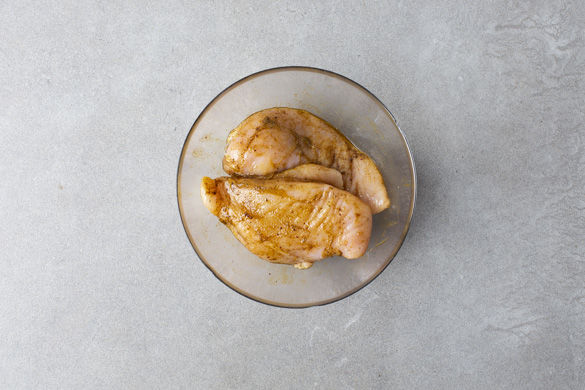 Den Backofen auf 220°C Umluft (240°C Ober-/Unterhitze) vorheizen. 2EL Olivenöl mit ca. 1/4 der Gewürzmischung oder nach Geschmack mehr verrühren. Das Fleisch mit etwas Küchenkrepp trocken tupfen, längs halbieren und mit dem Gewürzöl einreiben.
