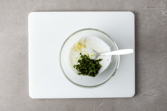 Die Minzeblätter abzupfen, ca. 1/3 der Minzeblätter für die Garnitur beiseitelegen, die restlichen Minzeblätter fein schneiden. Den Knoblauch schälen und fein würfeln. Den Joghurt mit der geschnittenen Minze, dem Knoblauch, 1–2EL Zitronensaft und 1 Prise Salz gut verrühren und beiseitestellen.