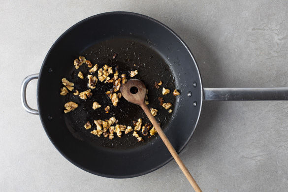 Die Walnusskerne grob hacken, in derselben Pfanne mit 2TL Olivenöl kurz anrösten und leicht salzen. Vorsicht, sie können schnell verbrennen. Den Apfel-Karotten-Salat auf dem Romanasalat verteilen, die Hähnchenbrust in Tranchen schneiden und neben dem Salat anrichten. Mit Minzedressig, Zitronenabrieb, Nüssen und Minzeblättern garnieren und servieren.
