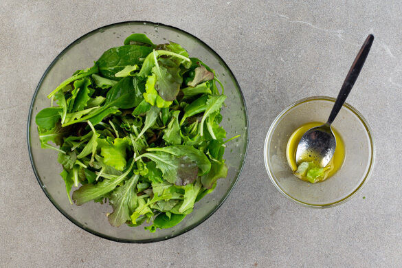 ½EL Olivenöl und ½TL Essig mit je 1 Prise Salz und Pfeffer verrühren. Den Salat kurz vor dem Servieren mit dem Dressing vermengen und auf Teller verteilen.