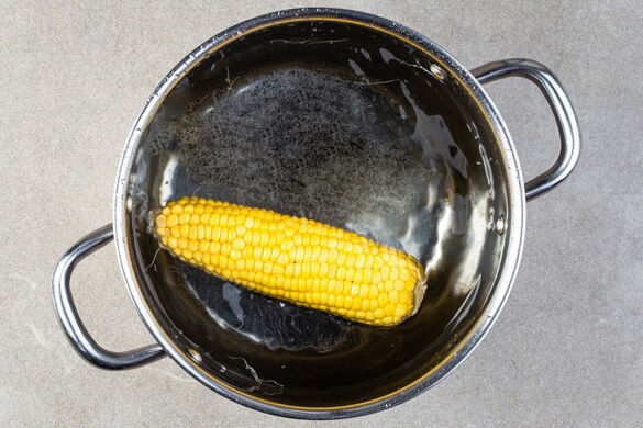 In einem mittelgroßen Topf ausreichend Wasser für den Mais zum Kochen bringen. Die Hüllblätter und Fäden entfernen und den Maiskolben in das kochende Wasser geben. Ca. 18Min. kochen, bis der Mais gar ist.