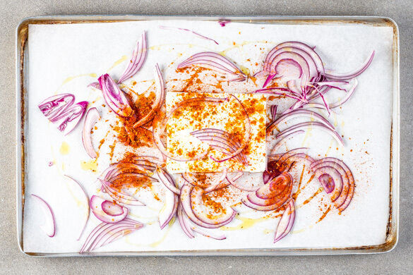 Den Feta und die restlichen Zwiebeln auf einem mit Backpapier ausgelegten Backblech mit der ½ der Gewürzmischung und 1EL Olivenöl vermengen und im Ofen in 10–12Min. goldbraun backen. Tipp: In den letzten ca. 4Min. der Backzeit die Grillfunktion einschalten.