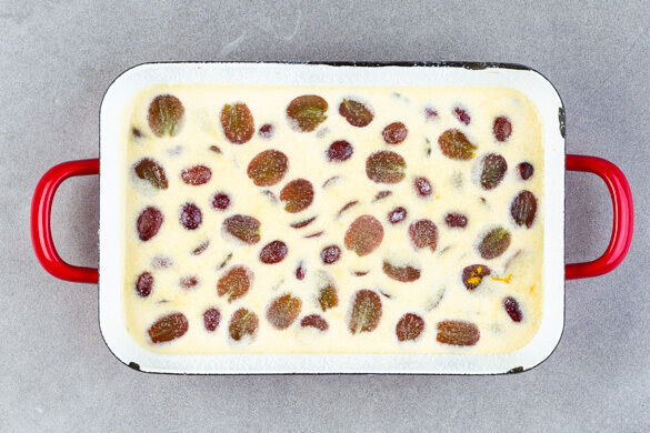 Den Teig in die Form füllen, glatt streichen, die Weintrauben darauf verteilen und mit 2TL Zucker bestreuen. Den Clafoutis im unteren Drittel des Ofens 25–30Min. backen. Der Clafoutis ist fertig, wenn bei der Messerprobe kein Teig am Messer haften bleibt.