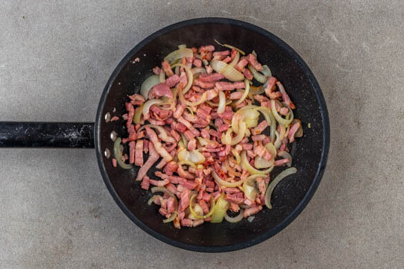 Den Speck in einer mittelgroßen Pfanne ohne Zugabe von Fett bei mittlerer Hitze 1–2Min. anbraten. Dann die Zwiebeln hinzugeben und 1–2Min. mitbraten. Vom Herd nehmen und die Speck-Zwiebel-Mischung etwas abkühlen lassen.
