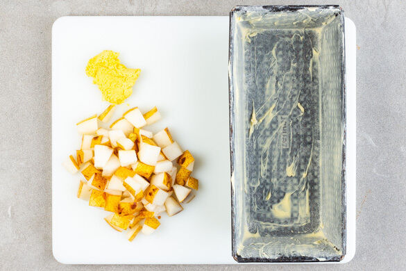 Den Backofen auf 190°C (170°C Umluft) vorheizen. Die Birnen vierteln, entkernen und in ca. 1cm kleine Würfel schneiden. Den Ingwer schälen und fein reiben. Zwei Kastenformen jeweils mit 1EL Butter oder Pflanzenöl fetten und mit 1–2TL Mehl bestäuben. Tipp: Wer mag, kann die gefetteten Formen auch mit Backpapier auslegen.