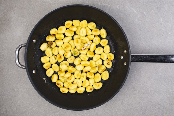 Die Gnocchi in einer großen Pfanne mit 2EL Olivenöl bei mittlerer Hitze in 8–10Min. goldbraun anbraten. Mit Salz und Pfeffer sowie Limettenschale und Limettensaft nach Geschmack würzen.