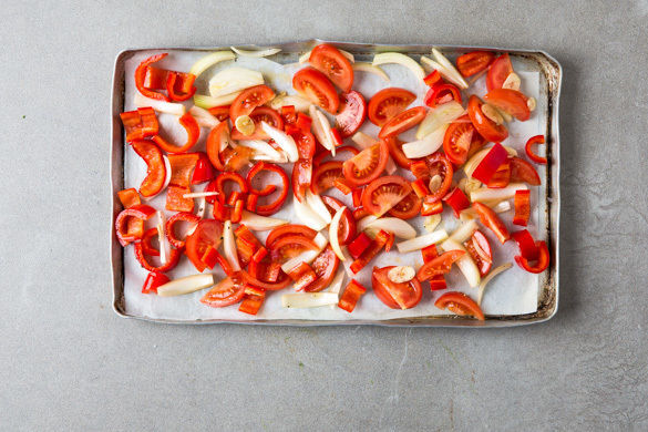 Das geröstete Brot vom Blech nehmen und beiseitestellen. Die Paprika, die Tomaten, die Zwiebeln und den Knoblauch auf dem Blech mit 2EL Olivenöl und je 1 kräftigen Prise Salz und Pfeffer mischen, gleichmäßig verteilen und 8–10Min. im Ofen grillen.