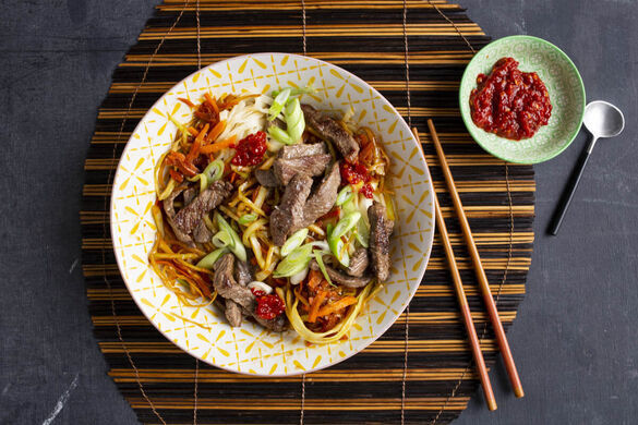 Du hast Lust auf ein schnelles und unkompliziertes Abendessen? Dann haben wir heute einen indonesischen Klassiker für dich: Es gibt Bami Goreng mit viel frischem Gemüse und zarten veganen Schnetzeln Rindfleisch-Art. Sambal Badjak und Ketjap Manis sorgen für den typischen Geschmack. Guten Appetit!