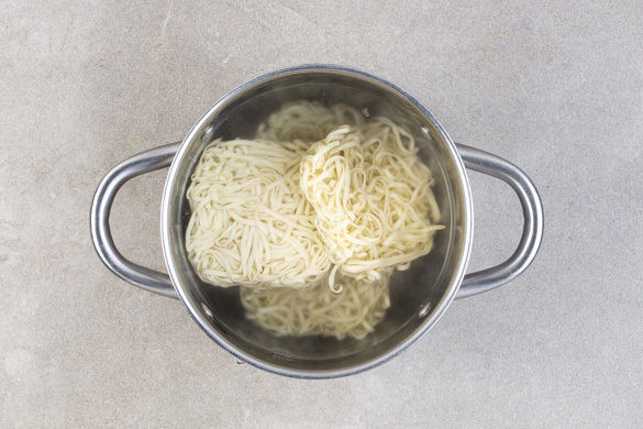 3/4 der Nudeln in das kochende Wasser geben und 2–3Min. vorkochen, die Nudeln sollen noch nicht gar sein. Tipp: Wer großen Hunger hat, kann auch alle Nudeln verwenden. In ein Sieb abgießen und warm halten.