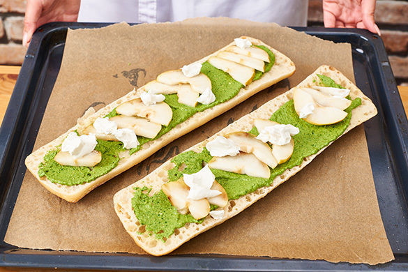 Die Baguettebrötchen aufschneiden und die Schnittflächen mit dem Pesto bestreichen. Mit den Birnenscheiben belegen und den Ziegenfrischkäse darüber krümeln.