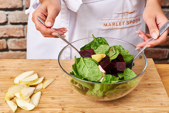 Die Birnen halbieren und entkernen, zwei Hälften in dünne Streifen, die anderen Hälften in ca. 2cm große Würfel schneiden. Die Rote Bete ebenfalls in ca. 2cm große Würfel schneiden. Die Birnenwürfel mit der Roten Bete und dem restlichen Spinat vermengen.
