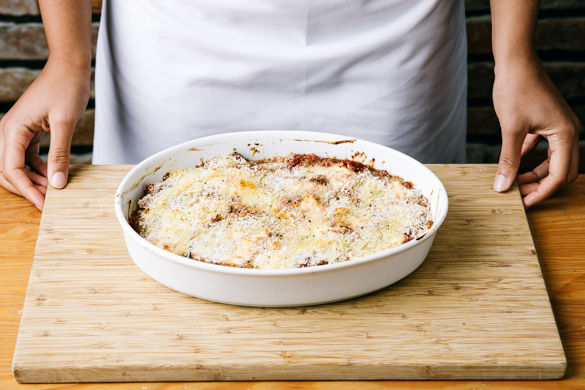 Den Auberginen-Champignon-Auflauf 12–15Min. im Ofen backen. Für die letzten 2–3Min. auf die oberste Schiene schieben, damit die Käsekruste goldbraun wird.