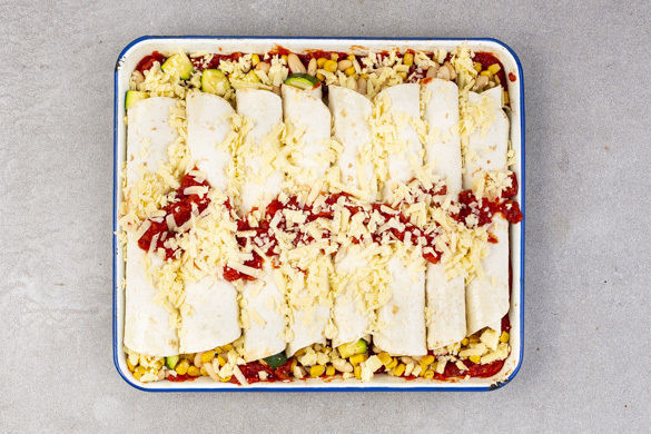 Die 1/2 der Tomatensauce in eine Auflaufform geben. 4 Tortillas gleichmäßig mit der Füllung und der 1/2 des Käses füllen. Die Tortillas einrollen und mit der Naht nach unten in die Auflaufform legen. Die restliche Tomatensauce darüber geben und mit dem Käse abschließen. Im Ofen 15–20Min. backen, bis der Käse goldbraun zerlaufen ist.