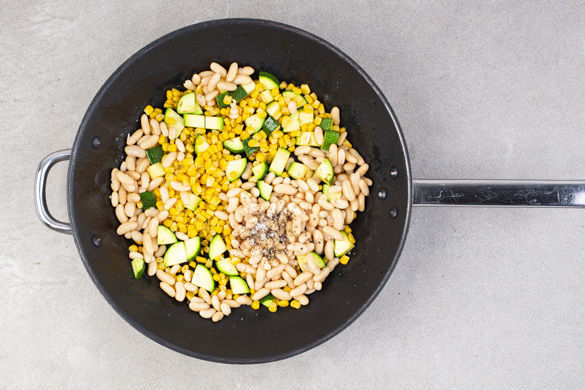 Die Zucchini in einer große Pfanne mit 1–2EL Olivenöl bei mittlerer bis hoher Hitze 5–8Min. anbraten. Mit Salz und Pfeffer würzen. Die Hitze auf die niedrigste Stufe reduzieren und den Mais und die Bohnen hinzugeben.
