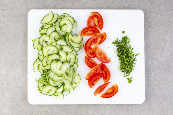 Die Gurke längs halbieren, mit einem kleinen Löffel entkernen und in dünne Scheiben schneiden. Die Tomaten halbieren und in möglichst dünne Spalten schneiden, dabei den Strunk entfernen. Den Koriander samt Stängeln grob schneiden.
