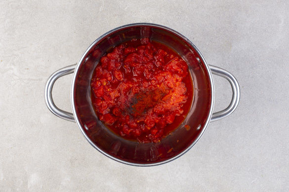Den Backofen auf 200°C Umluft (220°C Ober-/Unterhitze) vorheizen. In einem mittelgroßen Topf die gehackten Tomaten, 1 Prise Paprikapulver und 1EL Zucker bei mittlerer Hitze zum Kochen bringen. Sobald die Sauce kocht, die Hitze reduzieren und die Sauce 5Min. sanft köcheln lassen. Die Sauce mit Salz, Pfeffer und ggf. mehr Paprikapulver abschmecken.