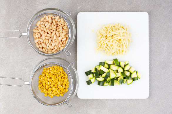 Die Zucchini längs vierteln und in ca. 1cm große Würfel schneiden. Den Mais und die Bohnen in ein Sieb abgießen. Den Käse auflockern.