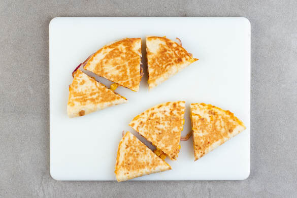 Wer heute etwas kochen möchte, das der gesamten Familie schmeckt und so leicht zuzubereiten ist, dass auch die jungen Tischgäste mitkochen können, sollte sich mit diesem Rezept beglücken: Tortilla-Knusperhülle, schmelzender Cheddar, Mais und rote Zwiebeln sind eine unschlagbare Kombination. Die vegetarischen Leckerbissen schmecken sogar so gut, dass sie schneller weg sind, als man „Thunfisch-Quesadilla“ sagen kann!