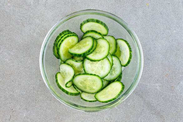 2EL hellen Essig mit ½TL Zucker und 1 kräftigen Prise Salz verrühren, bis sich der Zucker und das Salz aufgelöst haben. Die Gurke in dünne Scheiben schneiden und untermengen.