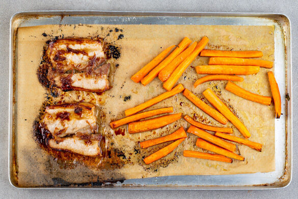 Den Bauchspeck jeweils quer halbieren, auf ein mit Backpapier ausgelegtes Backblech legen und mit der Ingwersauce bestreichen. Die Karotten ebenfalls auf das Backblech geben, mit 2EL Olivenöl und je 1 kräftigen Prise Salz und Pfeffer vermengen und alles 15–25Min. im Ofen backen, bis der Speck schön karamellisiert und knusprig ist und die Karotten gar sind.
