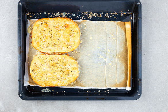 Den Backofen auf 200°C (180°C Umluft) vorheizen. Den Teig auf zwei Blechen ausrollen, jeweils in 4 gleich große Ovale schneiden und mit 2TL Olivenöl bestreichen. Mit der ½ der Gewürzmischung, 1EL Sesam und je 1 Prise Salz bestreuen und kleine Kuhlen in den Teig drücken. Die Teigreste in kleine Stücke schneiden, mit etwas Sesam und Salz vermengen und alles 8Min. backen.