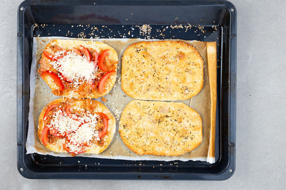 4 Focaccias wenden und mit dem Kimchi, den Tomatenstreifen und dem Käse belegen. Die übrigen Focaccias mit insgesamt 2TL Butter oder Olivenöl bestreichen. Je nach Ofen die Position der Bleche tauschen und die Focaccias weitere 4–6Min. backen.