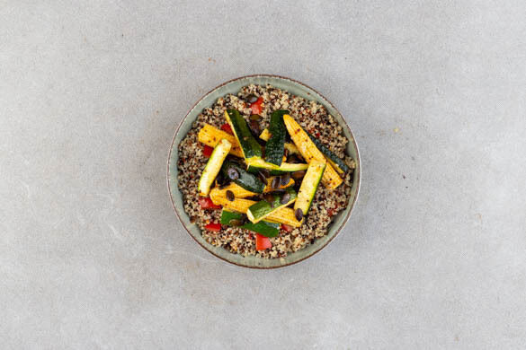 Lateinamerikanische Küche ist gerne mal recht fleischlastig – muss sie aber nicht sein! Wir zaubern heute einen veganen Latinotraum, der den guten Geschmack praktisch für sich gepachtet hat: Zucchini, zarter Babymais und knackige Kürbiskerne werfen sich pikant gewürzt zunächst in den Ofen und dann nussiger Quinoa an den dreifarbigen Hals. Dazu gibt’s eine limettig-duftige Creme mit optionalem Peperonikick. Träume werden wahr!