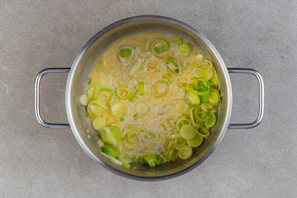 Im Kartoffeltopf 2EL Butter bei mittlerer Hitze schmelzen. Den Lauch und 1 kräftige Prise Salz zugeben und unter gelegentlichem Rühren ca. 4Min. anbraten. 100ml Milch angießen und erwärmen, dann den Topf vom Herd nehmen.