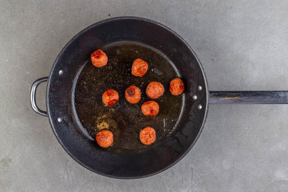 Das vegane Hack zu walnussgroßen Bällchen formen und diese in einer mittelgroßen Pfanne mit 1EL Pflanzenöl bei mittlerer Hitze rundum ca. 3Min. braten, bis sie leicht gebräunt sind.