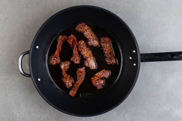 Den Bacon ohne Zugabe von Fett gleichmäßig in einer mittelgroßen Pfanne verteilen und bei mittlerer bis starker Hitze 5–6Min. braten, bis er knusprig ist, dabei regelmäßig wenden. Den Bacon aus der Pfanne nehmen und auf etwas Küchenpapier abtropfen lassen. Die Pfanne mit dem Bratenfett aufbewahren.